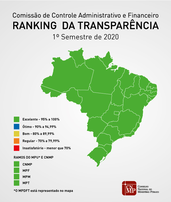 22/09/2020 - O Conselho Nacional do Ministério Público (CNMP) divulgou, nesta terça-feira (22), o resultado do Ranking da Transparência de todas as unidades e ramos do Ministério Público brasileiro relativo ao primeiro semestre de 2020. Todas, sem exceção, obtiveram índice superior a 96% na avaliação dos Portais Transparência do MP. Pernambuco se consolida no 1º Lugar do Ranking com índice de 100%, atingindo a excelente marca e o bom resultado social de prestação de contas à sociedade. Acesse o Mapa da Transparência.