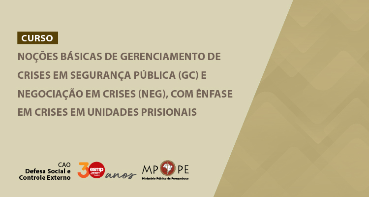 Inscrições abertas. Público-Alvo: Membros e Servidores do Ministério Público de Pernambuco e de outros ramos do MP brasileiro, integrantes das operativas do TJPE, TCE, da DPF, SDS e SEAP. Membros, servidores e integrante das forças de segurança e defesa social, da União, Distrito Federal e Estados, que atuem em crises com impacto no Sistema Prisional e na Segurança Pública, que demandem acompanhamento e ações do Ministério Público, nos termos da Resolução do CNMP nº 54, de 28 de março de 2017; Resoluções CNMP nº 277, 278 e 279 de 12 de dezembro de 2023 e Recomendação CNMP nº 90 de 22 de fevereiro de 2022.