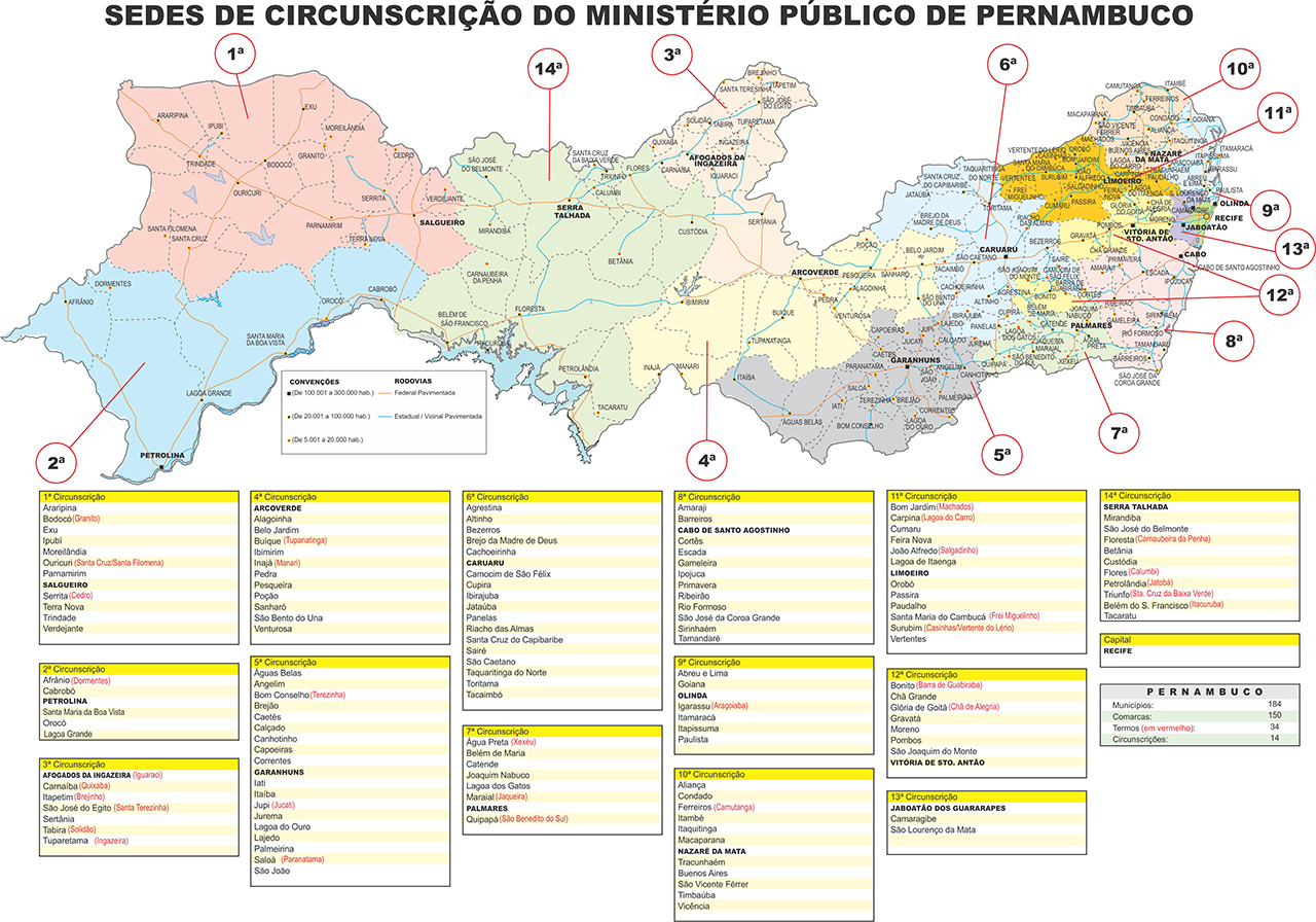 ARARIPINA Promotoria de Justiça pjararipina@mppe.mp.br (87) 99148-3818 R. JOSAFÁ SOARES, 165, VILA SANTA IZABEL 56280-000 Horário: 08h às 14h 1ª Circunscrição Ministerial (sede Salgueiro) ARCOVERDE Promotoria de Justiça pjarcoverde@mppe.mp.br (87) 99129. 2808 AV. CORONEL ANTÔNIO JAPIASSÚ, 781, CENTRO 56506-100 Horário: 08h às 14h 4ª Circunscrição Ministerial (sede Arcoverde) BARRA DE GUABIRABA É Termo de Bonito - endereço oficial da Promotoria de Justiça de Bonito pjbonito@mppe.mp.br (81) 99230.3541 AV. DR.ALBERTO DE OLIVEIRA, 373, CENTRO – BONITO CEP: 55680-000 Horário: 08h às 14h 12ª Circunscrição (Vitória de Santo Antão) BARREIROS Promotoria de Justiça pjbarreiros@mppe.mp.br (81) 99230.6445 PÇA. DO ROSÁRIO, S/N, CENTRO 55560-000 Horário: 09h às 15h 8ª Circunscrição Ministerial (sede Cabo) BELÉM DE MARIA É termo de Lagoa dos Gatos - endereço da Promotoria de Lagoa dos Gatos pjlagoadosgatos@mppe.mp.br (81) 99230.3580 R. PROF. MANOEL EDMUNDO, S/N, CENTRO 55450-000 Horário: 08h às 14h 7ª Circunscrição Ministerial (sede Palmares) BELÉM DO SÃO FRANCISCO Promotoria de Justiça pjbsfrancisco@mppe.mp.br (87) 99147.5117 AV. CEL. JERÔNIMO PIRES,1443, CENTRO 56440-000 Horário: 08h às 14h 14ª Circunscrição Ministerial (sede Serra Talhada) BELO JARDIM Promotoria de Justiça 1pjbelojardim@mppe.mp.br/ 2pjbelojardim@mppe.mp.br/ 3pjbelojardim@mppe.mp.br 1PJ: (81) 99319-1461; 2PJ: (81) 99230-6149 e 3PJ: (81) 99316-7822 AV. CEL. ANTÔNIO MARINHO, 208-A, BAIRRO AYRTON MACIEL 55154-015 Horário: 09h às 15h 4ª Circunscrição Ministerial (sede Arcoverde) BETÂNIA É termo de Custódia - endereço da Promotoria de Custódia pjcustodia@mppe.mp.br (87) 97400.2289 Rua Antônio Remígio da Silva, n.º 70, bairro Mandacaru (próximo à Escola Polivalente) 56.640-000 Horário: 08h às 14h 14ª Circunscrição Ministerial (sede Serra Talhada) BEZERROS Promotoria de Justiça pjbezerros@mppe.mp.br, 1pjbezerros@mppe.mp.br e 2pjbezerros@mppe.mp.br (81) 99230-7937 AV. FRANCISCA DE MORAIS LEMOS, S/N, BAIRRO SÃO PEDRO (FÓRUM LOCAL, BLOCO B) 55660-000 Horário: 08h às 14h 6ª Circunscrição Ministerial (sede Caruaru) BODOCÓ Promotoria de Justiça pjbodoco@mppe.mp.br (87) 99210-5751 AV. MARECHAL CASTELO BRANCO, 482, CENTRO 56220-000 Horário: 08h às 14h 1ª Circunscrição Ministerial (sede Salgueiro) BOM CONSELHO Promotoria de Justiça pjbomconselho@mppe.mp.br (87) 99159.4549 R. 07 DE SETEMBRO, 157, CENTRO 55330-000 Horário: 08h às 15h 5ª Circunscrição Ministerial (sede Garanhuns) BOM JARDIM Promotoria de Justiça pjbomjardim@mppe.mp.br (81) 99230-5235 R. TABELIÃO MANOEL ARNÓBIO SOUTO MAIOR, S/N, CENTRO (FÓRUM LOCAL) 55730-000 Horário: 08h às 14h 11ª Circunscrição Ministerial (sede Limoeiro) BONITO Promotoria de Justiça pjijbonito@mppe.mp.br (81) 99230-3541 AV. DR. ALBERTO DE OLIVEIRA, 373, CENTRO 55680-000 Horário: 08h às 14h 12ª Circunscrição Ministerial(sede Vitória de Santo Antão) BREJINHO É Termo de Itapetim - endereço oficial da Promotoria de Justiça de Itapetim pjitapetim@mppe.mp.br (87) 99203.9249 R. FRANCISCO SANTOS, 37, CENTRO – ITAPETIM CEP: 56720-000 Horário: 09h às 15h 3ª Circunscrição (Afogados da Ingazeira) BREJO DA MADRE DE DEUS Promotoria de Justiça pjbrejo@mppe.mp.br (81) 99130-5307 PÇA. ISBELO DE QUEIROZ CAMPOS, S/N, CENTRO 55170-000 Horário: 09h às 15h 6ª Circunscrição Ministerial (sede Caruaru) BREJÃO É termo de Garanhuns - endereço da Promotoria de Garanhuns pjgaran@mppe.mp.br (87) 99198.5403 R. JOAQUIM TÁVORA, 393, HELIÓPOLIS 55295-410 Horário: 08h às 14h 5ª Circunscrição Ministerial (sede Garanhuns) BUENOS AIRES É termo de Tracunhaém - endereço da Promotoria de Tracunhaém pjtracunhaem@mppe.mp.br (81) 99230.4755 RODOVIA BR 408, S/N, LOTEAMENTO VILA SANTA CRUZ – (FÓRUM LOCAL) 55805-000 Horário: 08h às 14h 10ª Circunscrição Ministerial (sede Nazaré da Mata) BUÍQUE Promotoria de Justiça pjbuique@mppe.mp.br (87) 99199-6207 AV. JONAS CAMELO DE ALMEIDA, S/N, CENTRO (FÓRUM LOCAL) 56520-000 Horário: 08h às 14h 4ª Circunscrição Ministerial (sede Arcoverde) CABO DE SANTO AGOSTINHO Promotoria de Justiça pjcabo@mppe.mp.br (81) 99232.4761 AV. PRESIDENTE GETÚLIO VARGAS, 464, CENTRO 54505-560 Horário: 08h às 14h 8ª Circunscrição Ministerial (sede Cabo) CABROBÓ Promotoria de Justiça pjcabrobo@mppe.mp.br (87) 99209-2896 AV. JOÃO PIRES DA SILVA, 805, CENTRO 56180-000 Horário: 08h às 14h 2ª Circunscrição Ministerial (sede Petrolina) CACHOEIRINHA Promotoria de Justiça pjcachoeirinha@mppe.mp.br (81) 99230-4237 R. DIVA VALENÇA DE MELO, 118, CENTRO (FÓRUM LOCAL) 55380-000 Horário: 09h às 15h 6ª Circunscrição Ministerial (sede Caruaru) CAETÉS Promotoria de Justiça reus@mppe.mp.br (87) 99191-5186 R. MELQUÍADES BORREGO, 20, CENTRO (FÓRUM LOCAL) 55360-000 Horário: 08h às 14h 5ª Circunscrição Ministerial (sede Garanhuns) CALÇADO É termo de Lajedo - endereço da Promotoria de Lajedo pjlajedo@mppe.mp.br (87) 99115.4609 RUA JOSÉ MÚCIO MONTEIRO, S/N, CENTRO (FÓRUM LOCAL) 55385-000 Horário: 08h às 14h 5ª Circunscrição Ministerial (sede Garanhuns) CALUMBI É Termo de Flores - endereço oficial da Promotoria de Justiça de Flores pjijflores@mppe.mp.br (87) 99212.4743 R. PEDRO SANTOS ESTIMA, 87, CENTRO – FLORES CEP: 56850-000 Horário: 08h às 14h 14ª Circunscrição (Serra Talhada) CAMARAGIBE Promotoria de Justiça admpjcamaragibe@mppe.mp.br (81) 99230.4563 AV. DR. BELMÍNIO CORREIA, S/N, TIMBI 54768-000 Horário: 07h às 13h 13ª Circunscrição Ministerial (sede Jaboatão) CAMOCIM DE SÃO FÉLIX Promotoria de Justiça pjcamocimdesaofelix@mppe.mp.br (81) 99230-7522 R. MANOEL SERAFIM SANTOS, 44, CENTRO (FÓRUM LOCAL) 55665-000 Horário: 09h às 15h 6ª Circunscrição Ministerial (sede Caruaru) CAMUTANGA É Termo de Ferreiros - endereço oficial da Promotoria de Justiça de Ferreiros pjferreiros@mppe.mp.br (81) 99230.5746 AV. FRANCISCO FREIRE DA SILVA, S/N, CENTRO 